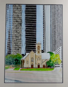 “Dr Miller was my teacher, my friend, and a second father to me,” Dr Terry says. “He was an artist and a dentist who painted. One time I asked him to paint me a picture of a clown, and in response he painted me as a clown in the dental mirror back when I was his student and asking him an endless stream of questions about everything. Later in his life, I commissioned him to go around Texas and paint churches. He made five paintings for me, which I have hanging in my office. One of them is of a little church in the middle of downtown Houston. It was sandwiched between all of these modern skyscrapers, and he had painted the reflection of the church in complete detail, just as it appeared on the huge glass skyscraper next to it. That painting taught me that we should look closer at the important things our friends and family are trying to share with us and not wait until they are gone. At the end of his life, he called and asked me to come to his home, where he told me he had liver cancer and only months to live. In the corner of his office, he had a painting wrapped up, and he said it was for me. It was this beautiful painting of a clown that I had always admired. And now I’m able to share the stories of what he taught me whenever I share that chapter with my colleagues or when patients ask about the paintings in my office, and I can share with them this beautiful smiling clown.”